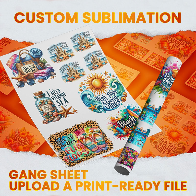 Experience the ultimate in custom sublimation with our high-quality, ready-to-press full-color Custom-Printed Sublimation Transfer Gang Sheets. Printed on 24" wide Epson DS Sublimation Transfer Paper, these sheets offer an exceptionally wide color gamut, delivering vibrant and precise designs for all your sublimation projects.